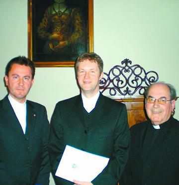 NEUER KAPLAN FÜR DIE MILITÄRSEELSORGE. Im Rahmen einer kleinen Feierstunde überreichte Militärdekan Dr. Christian Thomas Rachlé (links im Bild) dem künftigen Militärkaplan Dr. Markus Riegler (Bildmitte), der den Chorherren des Stiftes Vorau angehört, die Ernennungsurkunde des Bundesministers Mag. Norbert Darabos. Einer der ersten Gratulanten war Prälat Rupert Kroisleitner vom Stift Vorau (rechts im Bild).
