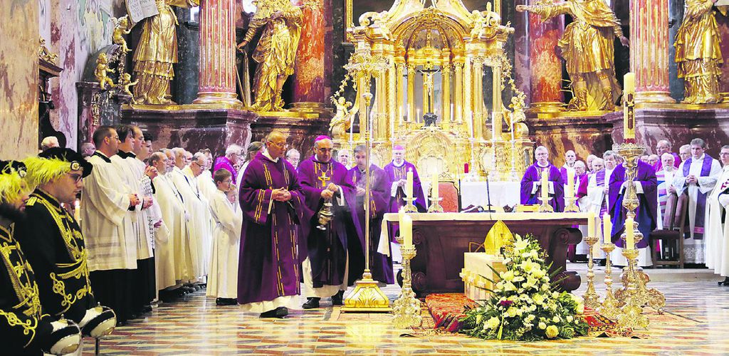 Requiem für den verstorbenen Abt Christian Feurstein in der Stiftsbasilika, deren Renovierung in seiner Amtszeit vollendet worden war. Bischof Wilhelm Krautwaschl, der im Bild den Altar und den Sarg mit dem Leichnam des Verstorbenen beweihräuchert, leitete den Gottesdienst; Bischof emer. Egon Kapellari, der 2010 die Eucharistiefeier zu Feursteins Abtbenediktion geleitet hatte, würdigte in der Predigt das Wirken des Verstorbenen. Christian Feurstein war als Prior des Stiftes Heiligenkreuz 2010 zum Abt von Rein gewählt worden, musste sein Amt aber 2015 wegen eines schweren Herzleidens niederlegen, dem er nun am 12. März erlegen war. Begraben wurde er im Friedhof des Stiftes Heiligenkreuz.